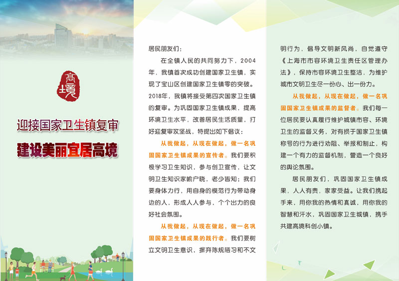 居民朋友们: 在全镇人民的共同努力下,2004年,我镇首次成功创建国家卫生镇,实现了宝山区创建国家卫生镇零的突破。2018年,我镇将接受第四次国家卫生镇的复审。为巩固国家卫生镇成果,提高环境卫生水平,改善居民生活质量,打好迎复审攻坚战,特提出如下倡议: 从我做起,从现在做起,做一名巩固国家卫生镇成果的宣传者。我们要积极学习卫生知识,参与创卫宣传,让文明卫生知识家喻户晓,老少皆知;我们要身体力行,用自身的模范行为带动身边的人,形成人人参与,个个出力的良好社会氛围。 从我做起,从现在做起,做一名巩固国家卫生镇成果的践行者。我们要树立文明卫生意识,摒弃陈规陋习和不文明行为,倡导文明新风尚,自觉遵守《上海市市容环境卫生责任区管理办法》,保持市容环境卫生整洁,为维护城市文明卫生尽一份心、出一份力。 从我做起,从现在做起,做一名巩固国家卫生镇成果的监督者。我们每一位居民要认真履行维护城镇市容、环境卫生的监督义务,对有损于国家卫生镇称号的行为进行劝阻、举报和制止,构建一个有力的监督机制,营造一个良好的舆论氛围。 居民朋友们,巩固国家卫生镇成果,人人有责,家家受益。让我们携起手来,用你我的热情和真诚,用你我的智慧和汗水,巩固国家卫生城镇,携手共建高境科创小镇。 高境镇创卫办 |